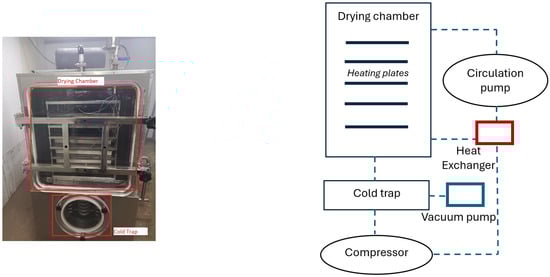 Experimental setup. (left) Photo and (right) overall design structure of shelf-type vacuum freeze-drying unit.