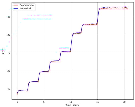 Figure 4 presents a comparison between the numerical and experimental data for temperature variation during both the primary and secondary drying processes. In this experimental scenario, the sample had a thickness of 5 mm.