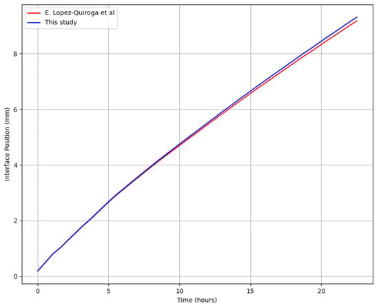 To verify the accuracy of the simulation results, a comparison was made with the data obtained by López-Quiroga et al. [31], who modeled the sublimation drying process of skim milk. The predicted sublimation front position shows good agreement with the results of López-Quiroga et al., as shown in Figure 5.