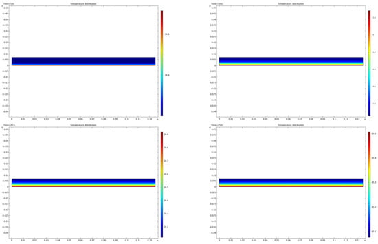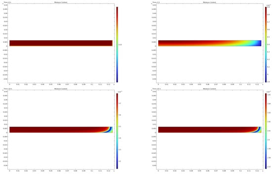 Figure 7 illustrates the moisture content distribution. The initial stage of drying shows a rapid decrease in moisture content near the surfaces in contact with the shelves, where heat is supplied. As drying progresses, the moisture front moves right to left, and the drying rate decreases.