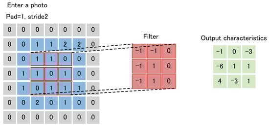 As shown in Figure 2, when an image with a size of 5 × 5 is entered, pad = 1, and after boundary filling, the image size is 7 × 7. The convolution operation is performed using a filter with a size of 3 × 3. The entire convolution process can be seen as the filter sliding sequentially on the input image, and the sliding step size is 2. The specific performance is to start from the upper left corner of the image, slide from left to right, and perform convolution operations at the same time. When one row is processed, the process moves on to the next row for the same operation until the entire image area is covered. After the end, a total of nine convolution results are obtained, and a 3 × 3 matrix is output, which is called a feature map. The expression is as follows: