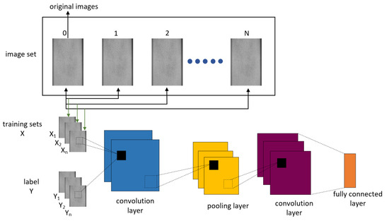 Based on the image recognition function of the CNN, feature extraction is performed on two structural experimental images with slight changes, and the displacement difference between the two images is identified to obtain the displacement cloud map. Firstly, DIC technology is used to calculate the displacement value between the images during the structural experiment as a label. The CNN is used to train and test the images taken during the experiment. Then, the displacement identified by the CNN is compared with the DIC results to determine the accuracy of the method. The process is as follows: (1) The image is taken from the structural experiment process and recorded as the original image in the data set. The original image is processed by DIC technology to obtain the displacement of the structure, which is recorded as a label in the data set. (2) The data set is enhanced; that is, the pixel value and displacement label value of the image are adjusted to the interval of [0, 1], and the image is cut into a small patch area of 32 × 32 pixels. (3) Different neural network models are trained with the same data set. By comparing the RMSE of the validation set, the optimal CNN model is selected and the hyperparameters of the model are confirmed. (4) The data set is input, and the optimal CNN model is used to read the image for the displacement recognition test. The flow chart of the method is shown in Figure 2, Figure 3, Figure 4 and Figure 5. The image before the structural deformation is selected as the initial image, and the deformed image is compared with the initial image in turn. It is represented by Xi (i = 1, 2…N), where Xi represents the i-th deformed image compared with the initial image, and N represents the total number of deformed images. At the same time, the horizontal displacement obtained by the DIC algorithm is represented by Yi (i = 1, 2…N), and Y is the training label. Then, X and Y are used as input data, and the network parameters are trained according to the value of label Y to continuously approach the label value.