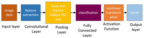 Specifically, the image data are input into the convolutional layer to extract features through the filter. The next step is to enter the pooling layer to maintain important features and reduce the amount of calculation, and then enter the fully connected layer for classification or regression. The activation function is used for nonlinear transformation, and finally the prediction result is output.