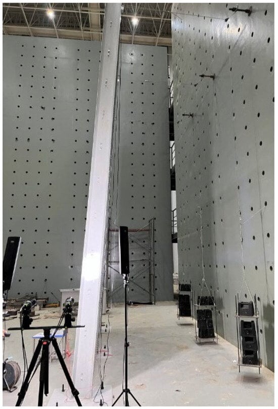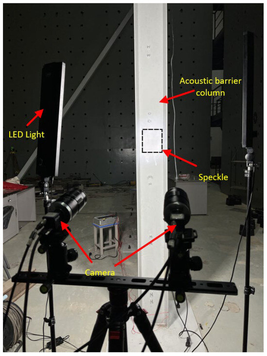 The XTDIC three-dimensional full-field strain measurement and analysis system was used to detect the image of the noise barrier column at the speckle level. The frame rate of the camera is 75 fps, the strain measurement accuracy is less than or equal to 50 με, the measurement range is 400 mm × 300 mm, and the distance is 0 to 10 m. Two charge-coupled element sensor (CCD) cameras were used for shooting, and DIC technology was used to analyze the deformation of the structure. These two digital cameras are equipped with a manually controlled aperture, focusing, and zooming 50 mm macro lens, which can capture images with an area of about 200 mm × 200 mm. The digital camera has a resolution of 5 million pixels and provides 256 levels of grayscale output. The calculation resolution of the DIC program is 0.01 pixels. The two cameras are located 1.0 m in front of the loading specimen. At the same time, two high-power LED lights are set next to the cameras to provide a light source sufficient for the shooting process. During the experiment, two cameras were used to take 20 photos per second throughout the whole process. The collected images were stored in the system and then analyzed using DIC software (2020, v4.1.0).