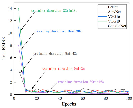 Upon analysis of Figure 8 after comparing the five different network models, LeNet, AlexNet, VGG16, VGG19, and GoogLeNet, we found that RMSE showed a certain decreasing trend with the increase in network layers, and the training time also increased accordingly. This shows that although a deeper network model may have stronger expression ability, there may be overfitting or computing resource bottlenecks during the actual training process, resulting in an increased error and a prolonged training time. Specifically: