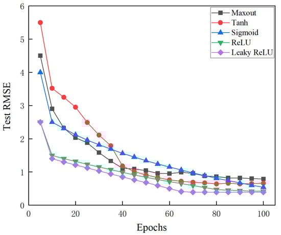 In order to select the optimal activation function, five functions, Maxout, Tanh, Sigmoid, ReLU, and Leaky ReLU, were introduced to retrain GoogLeNet. The results are shown in Table 3, and Figure 8 shows the change in the test set RMSE of the network under different activation functions during the training process.