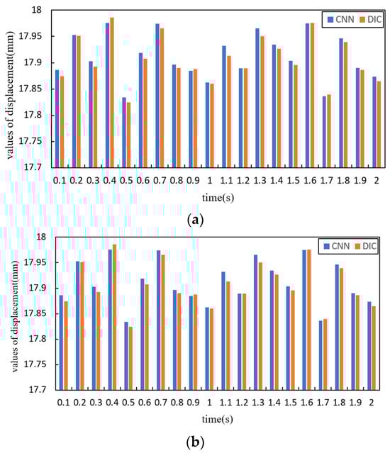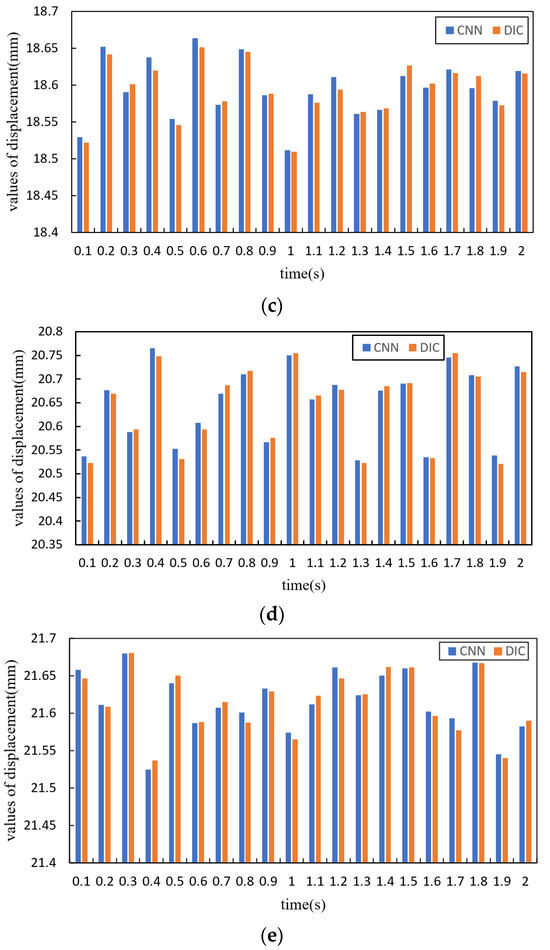 In the case of a full load of 1900 N, the displacement changes of these five points in the CNN recognition results are compared with the DIC calculation results within 2 s. The displacement changes measured by the two methods during the loading of the noise barrier column are shown in Figure 13.