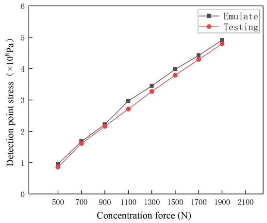 In a similar manner, the noise barrier was subjected to incremental loading in the simulation in order to obtain the stress value at each corresponding point. A comparison between the measured and simulated data is presented in Figure 14, which indicates that the simulated and measured stress data are approximately the same, with a relative error of less than 1% at the detection points. This serves to validate the accuracy of the simulation model.