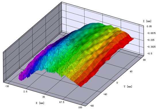 The displacement value was calculated by the digital image correlation (DIC) method and subsequently fitted by the partial least squares (PLS) method. Additionally, the total number of points of interest within the window was taken into account. For the fitting of more uniform deformation, the classical PLS method was more accurate. Figure 11 depicts the deformation cloud map of the sound barrier column subjected to an 1800 N load in the detection area of 1. The column, 6 m in height and 20 cm by 20 cm in cross-section, was tested. The digital image correlation (DIC) detection system recorded a total of 409,290 data points, which were subsequently analyzed using the Vic-3D software (2020, v4.1.0). All images of the deformation process were subjected to automated object identification (AOI) and post-processing analysis. The projection error was 0.052. This is due to the fact that a considerable number of offsets were observed on the right side of the column outside the detection area. Consequently, the displacement of the x-axis on the left was selected. The deformation of the sound barrier column at a distance of 1.6 m was recorded to be 21.5 mm.