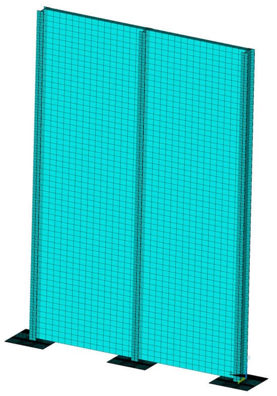 The sound barrier is a vertical sound barrier, which is designed as a detachable metal sound barrier. The sound barrier is 6 m high and 4 m long. The column is H-shaped steel, and the material is Q235B. The H-shaped steel column is of the standard size, 250 mm × 125 mm × 6 mm × 9 mm, the column height is 6 m, and the two columns are separated by 2 m; a total of two spans. The column is welded onto the bottom plate with dimensions of 750 mm × 750 mm × 8 mm. The screen plate is made of 5A03 aluminum alloy, 2 m wide and 0.5 m high, and the upper end is fixed with nuts. The thickness of the sound barrier material is 100 mm, and the screen body is composed of a 1.2 mm galvanized plate + 100 mm of sound-absorbing cotton + a 0.8 mm louvered orifice plate. The model is simplified. The screen plate is established as a 100 mm aluminum alloy solid plate with a perforation rate of 50%, and the bottom plate of the column is fixed with four bolts. The structural material parameters are shown in Table 1.