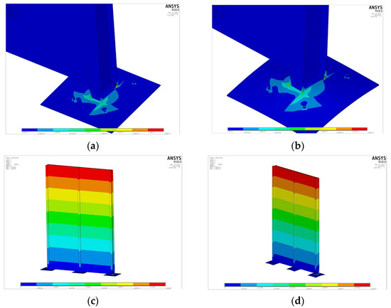 Following the completion of the simulation modeling, to obtain the cloud diagram in Figure 17, the calculated cloud diagrams of the sound barrier under the influence of uniform and concentrated forces could be obtained. Following the completion of the numerical analysis, it can be concluded that when the concentrated force was 1800 N, the maximum value of the stress of the sound barrier was 2.46 × 109 Pa and the maximum value of displacement was 0.083815 m, with an error of less than 1%. Furthermore, the overall cloud diagrams of the model are essentially identical.