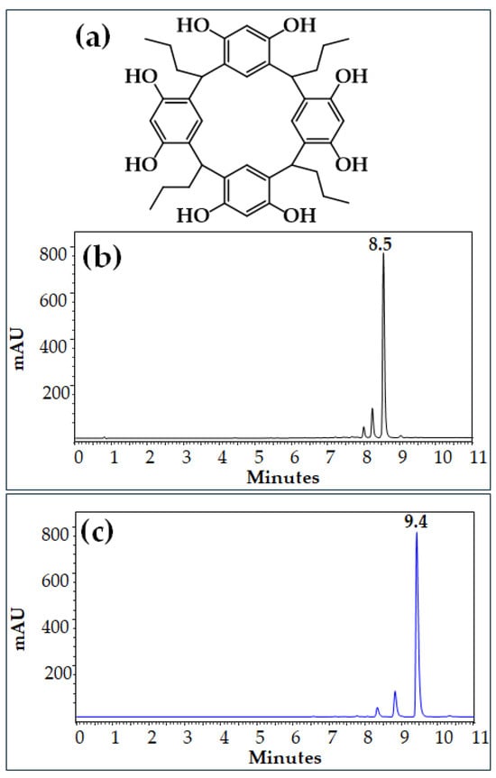 Resorcinol (4 mmol) was dissolved in 30 mL of ethanol, followed by the addition of 12 mL of 37% hydrochloric acid under constant stirring. Separately, butanal (4 mmol) was dissolved in 20 mL of ethanol and added dropwise to the reaction mixture. The resulting mixture was stirred under reflux for 6 h, yielding a translucent yellow solution. Upon cooling, 150 mL of Type I water was added, resulting in the formation of a yellow precipitate, which was collected by filtration, washed thrice with water, and dried under reduced pressure. The calix[4]resorcinarene was analyzed by RP-HPLC, using a linear %B gradient; the elution program was 5/5/100/100/5/5 at 0/1/11/14/14.1/17 min. The final product was characterized by RP-HPLC, 1H NMR, 13C NMR, and ATR-FTIR (see Figures S1–S3).