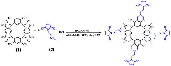 The functionalization of the top edge, at position 2, of compound 1 by Mannich-type aminomethylation reaction using 1-(2-aminoethyl)maleimide hydrochloride (2) was explored. Since this reagent is in the hydrochloride form, diisopropylethylamine (DIPEA) was added as a base to adjust the pH to 7.5. DIPEA, being soluble in organic solvents and non-nucleophilic, does not participate in the aminomethylation reaction. Based on previous reports, a tetrasubstituted reaction product was expected (Figure 2) [12,14].