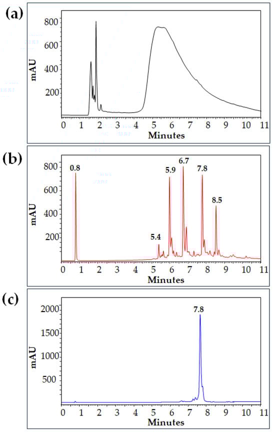 Chromatographic analyses of aminomethylation reaction of compound 1 with maleimide-derivate 2 using: (a) core-shell column, (b) monolithic column. In (c) the monosubstituted compound 3 is shown, after being isolated by RP-SPE.