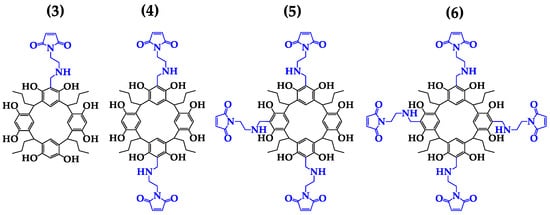 Structure of the (maleimide)n-C-tetra(propyl)calix[4]resorcinarene obtained in the reaction between 1 and 2: mono (3), di (4), tri (5) and tetrasubstituted (6).