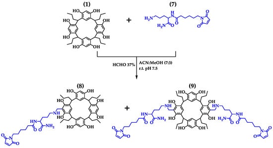 C-tetra(propyl)calix[4]resorcinareno (1) (1 mmol) was dissolved in 16 mL of a mixture of ACN/MeOH (1:1); 1040 μL (15 mmol) of formaldehyde was added, and the mixture was stirred constantly. A total of 10 mL of a methanolic solution of N-(1,5-diamino-1-oxopentan-2-yl)-6-maleimidohexanamide (5) (6 mmol) was added. The pH of the mixture was adjusted to pH 7.5 with DIPEA and left under constant stirring at room temperature for 30 h. The progress of the reaction was monitored by RP-HPLC, where the formation of two products was observed. The resulting mixture was acidified with a 12% MeOH/TFA solution until pH 3.0, and it was concentrated in a rotary evaporator until dryness. The solid was washed with water to remove the excess compound 5, the water was removed by rotary evaporation, and the solid was reconstituted with 1000 μL of MeOH. Purification was carried out on Supelclean ENVI -18 SPE columns. The SPE columns were activated using three successive volumes of the following solvents: MeOH, 0.05% H2O-TFA, 0.05% ACN-TFA, and 0.05% H2O-TFA. The reconstituted product was loaded on the activated and equilibrated SPE column, and the elution of each of the products was carried out by increasing the percentage of solvent B in the eluent. The collected fractions were analyzed by RP-HPLC and those where each of the functionalized calix[4]rersorcinarenes were enriched were mixed, frozen, and lyophilized, obtaining the solid products [20]. The mono and disubstituted products with compound 5 were characterized by RP-HPLC, LRMS, and 1H NMR (see Figures S7–S10).