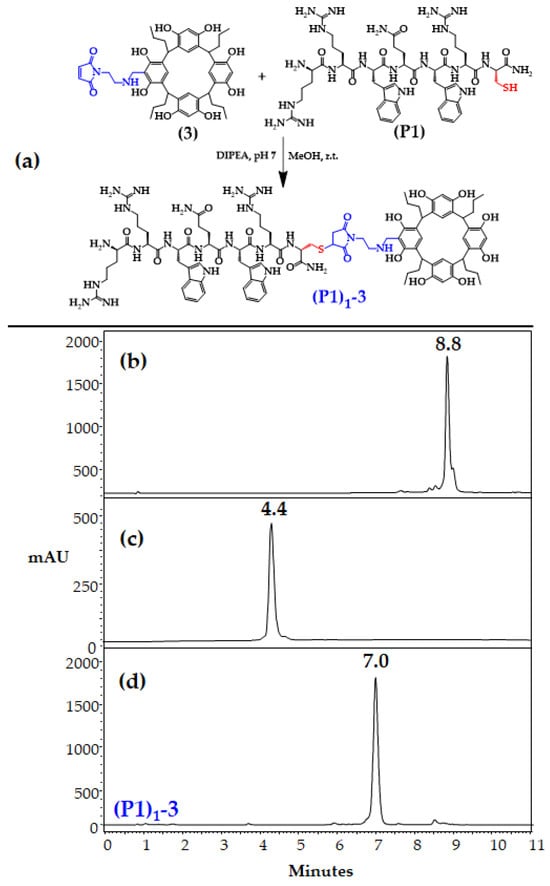 Therefore, the pH was adjusted to 7.0 using DIPEA, a non-nucleophilic base. At this pH, quantitative formation of the first conjugate (peptide)n-calix[4]resorcinarene was observed, indicating how sensitive this reaction is to pH. Figure 6, panel (a), shows the reaction scheme for obtaining the monosubstituted (P1)1-3 conjugate. Using the previously established analytical conditions with the monolithic column, the starting reagents and the reaction mixture were analyzed. Figure 6 panels (b) and (c) show the chromatogram of compound 3, and peptide P1 respectively. Panel (d) presents the chromatographic profile of the reaction mixture, where the (P1)1-3 conjugate was obtained quantitatively.