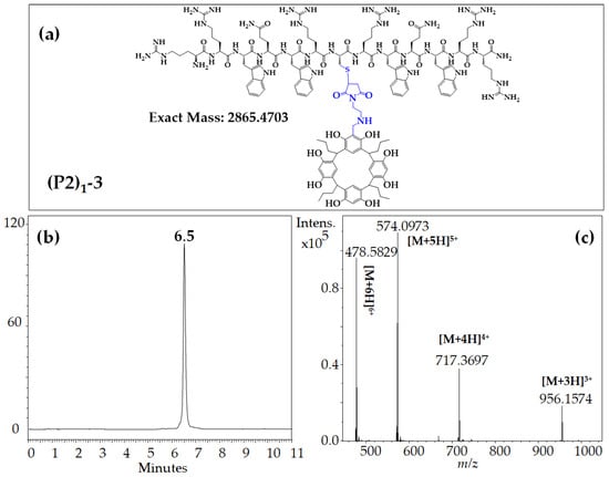 As an example, Figure 7 shows the molecular structure of conjugate (P2)1-3 (panel a), a macromolecular, rather bulky structure, and the chromatographic profile of the solid product that was purified by RP-SPE (panel b). The retention time of this conjugate, with the thirteen-residue peptide, tR = 6.5 min is shorter than for the (P1)1-3 conjugate (Figure 6c), which is consistent given that there is a higher amount of arginine in the P2 sequence. In panel c, the mass spectrum of the purified conjugate is shown, where signals corresponding to the multicharged species [M+6H]6+, [M+5H]5+, [M+4H]4+, and [M+3H]3+ are observed. With this information, the experimental mass (MExp.) was calculated to be 2865.4755 u, compared with the theoretical mass, M: 2865.4703 u (error of 2 ppm).