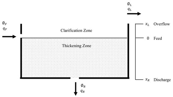 Schematic representation of a thickener, showing the clarification and thickening zones. The diagram illustrates the feed input (, ), overflow output (, ), and underflow output (, ), along with the spatial coordinates (, 0, ) that correspond to the overflow, feed, and discharge positions, respectively.