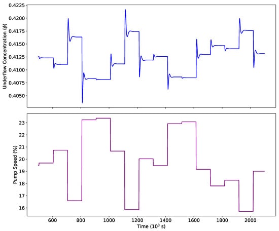 Underflow concentration of a simulated thickener in open loop. The data was obtained using a dynamic simulation with a sampling interval of 10 s. The underflow concentration and pump speed are plotted over time, showcasing the system’s response to input changes. For clarity, only a subset of the simulated data points is shown to highlight trends and key behaviors.