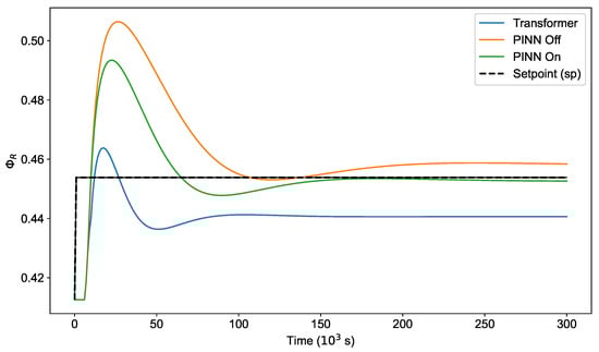 Additionally, it is worth noting that, in certain instances, models trained without PINN slightly outperform those incorporating PINN. This can be attributed to the fact that Figure 8 displays the average error between the setpoint and the process over the entire duration of the simulation. Figure 10, on the other hand, presents the average error across all simulations at each point in time, showing that the PINN model exhibits a higher error at the onset of the setpoint change but eventually stabilizes to a lower error.