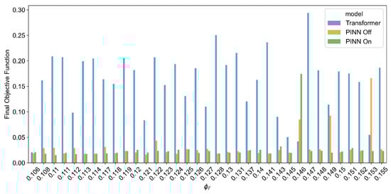 Average performance of different models in an MPC application across various values. The bar plot compares the final objective function achieved by the transformer-only model, PINN Off, and PINN On models. Transfer learning-based models (PINN Off and PINN On) consistently outperform the transformer-only model.