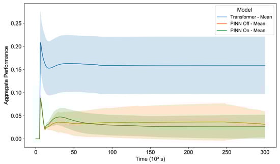 MPC performance comparison of three models—transformer, PINN Off, and PINN On—using aggregate performance as a metric over time. The solid lines represent the mean performance for each model, while the shaded regions indicate variability (e.g., confidence intervals) across trials. The results demonstrate that the PINN On model achieves a stable and lower aggregate error compared to the PINN Off model, while the transformer model exhibits higher variability and error.