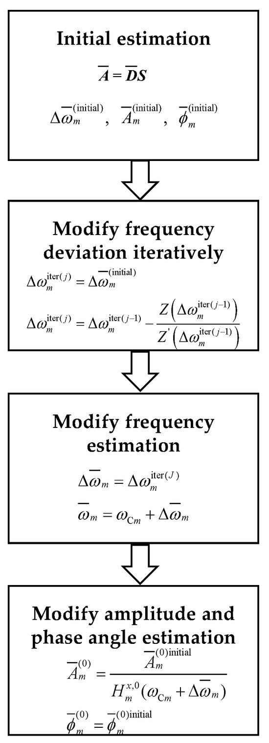 Step 3: Construct Equation and its derivative ; then, initialize . Use Equation (22) to iteratively correct the frequency deviation where represents the result of the j-th iteration. J is the final number of the iterations where is not the same as .