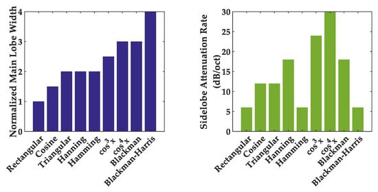 The essence of the signal windowing is to truncate the signal. The performance of the commonly used window functions is shown in Figure 3 [33,34,35]. The rectangular window has the narrowest main lobe, but its sidelobe attenuation rate is the slowest. The sidelobe attenuation rate of the cosine window is twice that of the rectangular window, with the main lobe’s width increasing to 1.5, offering no significant advantage over the triangular window. The triangular window has a main lobe width of 2.0, but the sidelobe attenuation rate is the same as that of the cosine window. The Hanning window has a main lobe width that is twice that of the rectangular window, but its sidelobe attenuation rate is three times faster. The main lobe width of the Hamming window is the same as that of the Hanning window, but its sidelobe attenuation rate is the same as that of the rectangular window. Compared to the Hanning window, the window has a faster sidelobe attenuation rate but a wider main lobe width. The main disadvantage of the Blackman window is that its main lobe width is three times that of the rectangular window. The window has a sidelobe attenuation rate that is six times faster than that of the rectangular window, and its main lobe width is three times that of the rectangular window. The main lobe width of the Blackman–Harris window is four times that of the rectangular window, and its attenuation rate is the same as that of the rectangular window. In summary, using the window to suppress spectral leakage is reasonable, as it ensures a relatively narrower main lobe width while enabling rapid sidelobe decay. In this paper, the window was used.