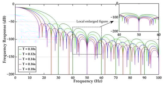 The window interval should promise that the stopband interference can be reduced to a level that is at least below the noise while being as short as possible. The noise is mainly related to the analog-to-digital conversion quantization noise and the background noise, usually assumed to be Gaussian white noise. The commonly used 16-bit analog-to-digital converter introduces a quantization noise signal-to-noise ratio (SNR) of 98.08 dB. The SNR of the background noise in the power grid signal is generally 60 dB. Therefore, it is reasonable to choose a window interval that achieves at least −100 dB of the attenuation level at the stopband interference. The frequency responses of the window with different window intervals are shown in Figure 4, and the window interval was chosen to be 0.16 s.