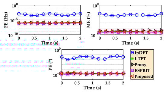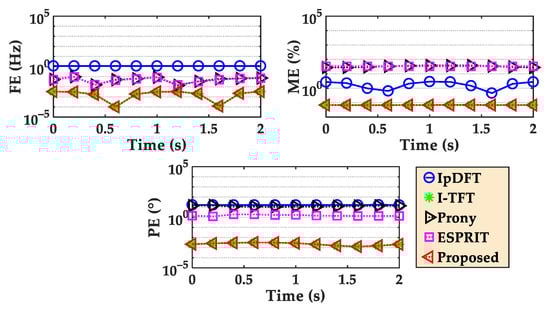 The mean estimation errors of the 1000 repeated tests of scenario 2 are shown in Figure 7. The estimation errors of the IpDFT method are larger than those in scenario 1, indicating that the harmonic, dynamic changes have a far greater impact on the estimation accuracy of IpDFT than the spectral leakage caused by non-synchronous sampling. Since the autocorrelation model also does not consider the dynamic process of the signal, the estimation errors of the Prony and ESPRIT methods increase compared to scenario 1. The proposed method and I-TFT method have the smallest estimation errors with an FE of 3.3 × 10−3 Hz, ME of 6.8 × 10−2%, and PE of 3.2 × 10−3 degrees, which are slightly higher than those in scenario 1.