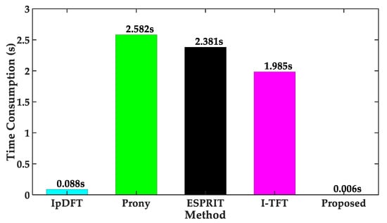 The computational time consumption of each method was tested using MATLAB 2016b on the computer with a CPU 12th Gen Intel(R) Core(TM) i7-1265U @ 2.70 GHz, RAM 32 GB, 64-bits Windows 11 operation system of surface laptop 5 manufactured in the United States. The comparison of the average time consumption of the three methods is shown in Figure 9. It can be seen that the proposed estimator achieved a computational speed-up of approximately 430, 396, and 330 times compared to the Prony method, ESPRIT method, and I-TFT method, respectively.
