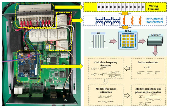 The proposed estimator was implemented on the embedded prototype, as shown in Figure 10. The signal first entered the prototype through the wiring terminal and was then converted into the 3.3 V level signal by the instrumental transformer. The transformed signal was sampled by the analog-to-digital conversion (ADC) core at a 12.8 kHz sampling rate and then was fast written into flash memory through FPGA. Then, the proposed estimator was implemented in the C6748 DSP module. It should be noted that a high-performance microcontroller or DSP can be alternatively used instead of an FPGA to achieve high-speed sampling. However, the sampling process would interrupt the measurement algorithm that the DSP is currently executing, thereby additionally increasing the computational load of the DSP. On the other hand, using an FPGA for sampling control allows the DSP to directly read the buffered sampling sequence from flash memory only when it needs to execute the measurement algorithm, enabling the DSP to perform the measurement algorithm more quickly. Thus, FPGA was used for the high-speed sampling in this paper. To estimate 50 harmonics, the initial estimation step takes around 20 milliseconds (ms). The frequency deviation calculation step and estimation modification step take around 0.5 ms. The computational load rate for executing the proposed estimator and estimating 50 harmonics was approximately 2.05%.