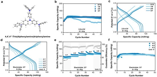 Organic materials have unique advantages for applications in batteries, benefitting from the low cost and structure flexibility. Generally, organic materials for anion storage in DIBs possess p-type redox active centers. Quaternization chemistry of amine was frequently used for anion storage at high potential []. Here, a small aromatic amine molecule, 4,4′,4″-tris(diphenylamino)triphenylamine (N4) (Figure 1a), consisting of four amino (NR3) groups and nine aromatic rings, was applied as the cathode material in the EC-containing electrolyte for DIBs. The four NR3 groups in N4 would ensure multi-electron transfer during the quaternization reaction, leading to a high theoretical capacity of 143 mAh/g; the aromatic rings may help stabilize the resulting N radical cation by electron delocalization. Further, N4 has a 3D conformation in which each N center is well separated and accessible. In addition, the relatively large molecular weight (Mr = 746.94 g/mol) and high conjugation may reduce its solubility in electrolytes, even under a fully charged/oxidized state. In the Fourier transform infrared (FTIR) spectrum of N4 (Figure S3a), the absorption peak at 1265, 1489, and 1587 cm−1 are attributing to the stretching vibration of the C-N single bond, C-C single bonds, and aromatic rings, respectively [,,]. Additionally, the characteristic peaks at 995, 1158, and 1282 cm−1 in the Raman spectrum (Figure S3b) represent C-H, C-N, and C-C bonds, respectively []. Meanwhile, the X-ray diffraction (XRD) pattern (Figure S3c) and SEM measurement (Figure S3d) reveal that the N4 molecule exhibits certain crystallinity with a rod-like morphology.
