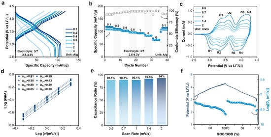 (a) Charge–discharge curves of N4 electrode at different current rates. (b) Rate performance of N4 electrode at different current rates. (c) CV curves at different scan rates. (d) b-values obtained at different scan rates. (e) Pseudocapacitive contribution of N4 electrode at different scan rates. (f) Diffusion coefficients determined by GITT.