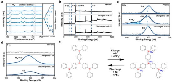 The XPS of N4 at different states also exhibits similar changes (Figure 3b,d). No F or P signals were detected in the pristine N4 electrode. Upon charging to 4.3 V, the signals with binding energy at 135, 192, and 686 eV greatly increased, which belong to P 2p, P 2s, and F 1s, respectively, representing the insertion of PF6−. After fully discharging to 2.5 V, the intensity of the F and P signals decreased much, indicating that PF6− were removed from N4. The weak signal of F and P may derive from PF6− trapped in the electrode or the formed inorganic-rich interphase. High-resolution XPS for N 1s and F 1s (Figure 3c,d) provided a clear view of the redox process. The binding energy of N 1s at the charged state shifted to a higher value compared to the pristine and discharged ones, indicating an electron deficient state of the N4 electrode at 4.3 V and a sign of quarternary amine cation (NR4+). At the same time, a new peak located at 403 eV appeared, which belongs to the interaction of N-PF6−. In terms of F 1s, a stronger PF6− signal was detected at 687 eV at a fully charged state, and the residual F signal is noticed, too. Overall, the electrochemical energy storage mechanism is illustrated in Figure 3e, where four N centers (NR3) are oxidized to form quaternary amine radical cations (NR4•+). The four NR4•+ will further dynamically form quinone diiminium from a low-energy perspective.