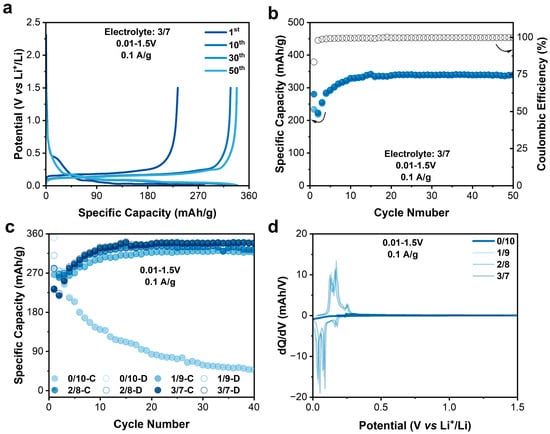 Under reasonably low cost, the commercial electrolytes for LIBs possess balanced properties among ionic conductivity, electrochemical window, interphase forming, and compatibility. Developing new energy storage devices based on these mature electrolytes will potentially reduce the manufacturing cost and increase the technology readiness level. In commercial Li-ion electrolytes, EC is a key component to form SEI on graphite anodes. It, however, plays an adverse effect on graphite cathodes in DIBs. Zhang et al. studied the effect of solvents on the insertion of PF6− into graphite and drawn the conclusion that with the interlayer distance between the adjacent graphene layers, EC-solvated PF6− was much larger than that in the pristine graphite, making it difficult for intercalation to occur []. To investigate the effect of a commercial LiPF6 EC/EMC electrolyte on a graphite cathode, a Li–graphite half cell was built with mesocarbon microbeads (MCMBs) as the graphite source (Figure S1). Four electrolytes with different EC ratios were prepared accordingly: 2 M LiPF6-EMC, 2M LiPF6-EC/EMC (1:9, v/v), 2M LiPF6-EC/EMC (2:8), and 2M LiPF6-EC/EMC (3:7, referred to 0/10, 1/9, 2/8, 3/7 in the following text). The MCMB cathodes were tested at a low current density of 0.1 A/g at 3–5 V vs. Li+/Li. For the MCMB cathodes, when the EC ratio increased, there was a significant decrease in capacity during the cycling test (Figure S2a). The stable capacities achieved were 83, 57, 29, and 29 mAh/g for the 0/10, 1/9, 2/8, 3/7 electrolytes. From the dQ/dV curves (Figure S2b), it was clear that the addition of EC increased the onset intercalation potential of PF6− into the MCMBs from 4.3 to 4.4 to 4.6 V, resulting in a decreased capacity.