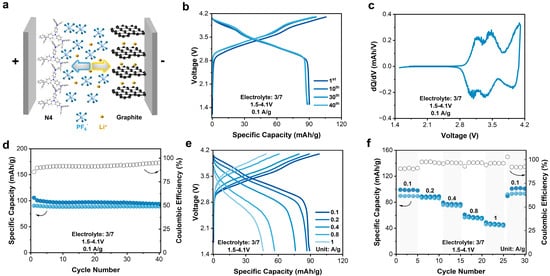 The following supporting information can be downloaded at: https://www.mdpi.com/article/10.3390/pr13010232/s1. Figure S1. (a) XRD spectrum. (b) Microscopic morphology of MCMB; Figure S2. (a) Cycling performance comparison of graphite cathodes in electrolytes with different EC contents. (b) 50th cycle dQ/dV of graphite cathode in electrolytes with different EC contents. (c) 1st cycle charge discharge curves of graphite cathode in electrolytes with different EC contents. (d) 50th cycle charge discharge curves of graphite cathode in electrolytes with different EC contents; Figure S3. (a) FITR spectrum, (b) Raman spectrum, (c) XRD pattern and (d) SEM image of N4; Figure S4. Charge discharge curves of N4 cathode in (a) 0/10 electrolyte, (b) 1/9 electrolyte, (c) 2/8 electrolyte and (d) 3/7 electrolyte. The irreversible capacity in initial cycles may come from electrolyte decomposition and interphase formation, which is necessary for stable cycling of N4 electrodes; Figure S5. Cycling performance of N4 cathode at 1 A/g; Figure S6. SEM images of N4 electrode (a) at pristine state, (b) after one cycle and (c) after 50 cycles; Figure S7. XRD patterns of N4 powder, SP, PP separator, pristine N4 electrode and cycled N4 electrodes; Figure S8. A photo of N4 electrode after cycling; Figure S9. (a) Charge discharge curves of MCMB anode at different charge discharge rates. (b) of the rate performance of MCMB anodes at different rates; Figure S10. (a) Cycling performance of Full battery at 1A/g. (b) Charge-discharge curves at different cycles.