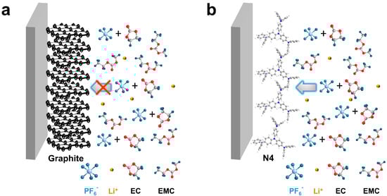 Schematic illustration of (a) graphite cathode and (b) N4 cathode working in commercial EC-containing Li-ion electrolyte.