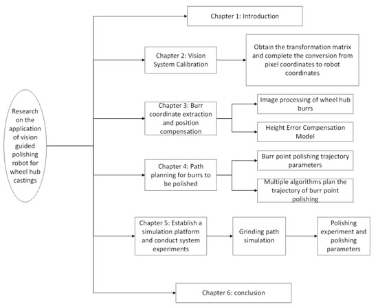 At present, the grinding of the burr of the wheel hub casting tends to be polished by combining vision and force sensors, mainly to polish the overall outline of the wheel hub and the grinding is not targeted; based on this, it is proposed to use vision to find the burr point and then seek the optimal grinding sequence of the burr point through the intelligent optimization algorithm, and finally all the burr points on the wheel hub can be polished in a targeted manner, without the need to polish the overall profile of the wheel hub, to improve the grinding efficiency. Based on the above analysis, in response to the wheel hub burr grinding needs of a foundry, this paper integrates vision technology with robots to complete the rough grinding of wheel hub burrs. First, the vision system extracts the wheel hub 2D image and performs burr coordinate extraction, the main work outline is shown in Figure 1. Then, a height compensation model is applied to correct the coordinates and improve the grinding accuracy since the height difference of the burrs will cause the 2D coordinates to deviate. Next, the grinding trajectory is designed to improve efficiency using an intelligent optimization algorithm. Finally, a simulation model is set up, and experiments are conducted to verify the relationship between the spindle speed and the roughness and, finally, to determine the effective grinding parameters. The experiments show that the system can grind wheel hub burrs quickly, accurately and effectively. In actual grinding operations, it can liberate a certain amount of labor force, which can be converted to robots for grinding, thereby shortening the grinding time and improving the grinding quality.