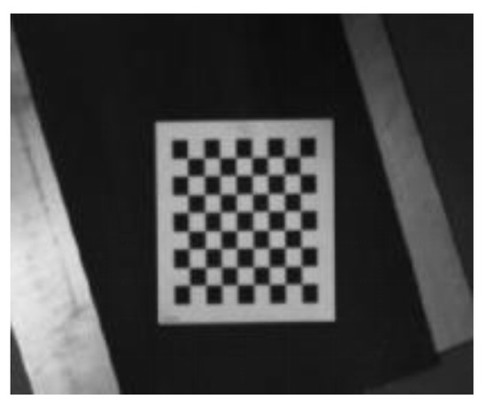 Determining the camera’s internal and external parameters is the main purpose of camera calibration. Internal parameters include focal length, center of gravity and distortion coefficients. The external parameters describe the position and orientation of the camera in the world coordinate system, where the position is the specific location of the camera in the world coordinate system. Camera calibration methods mainly include traditional calibration, self-calibration, and Zhang’s method [16]. Zhang’s method is adopted in this paper using a checkerboard calibration plate measuring 200 × 200 mm, consisting of 7 × 7 alternating black and white squares, each measuring 18 × 18 mm. With an accuracy of ±0.05 mm, the chessboard is made of alumina to avoid glare. The chessboard selected for the experiment is shown in Figure 2.