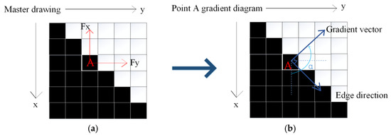 HE can effectively represent the shape of burr defects. However, image enhancement operators are needed to process the burr edge information for subsequent image difference comparison and accurate burr defect extraction. The core idea of image edge detection is based on gradient, which measures the rate of change of image intensity. Gradients are large at edges where gray values change significantly and small in smooth areas. Since images are 2D discrete data, the gradient at the point (x, y) can be calculated by generalizing the partial derivative method of continuous functions, as shown in Figure 7.