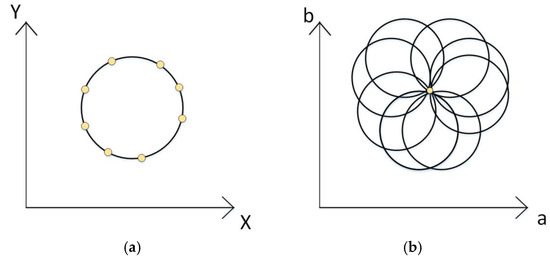 In image space, multiple points on a circle can be obtained by Formula (8). This is then transformed into multiple corresponding circles in parameter space, as shown in Formula (9). The center of the circle in parameter space corresponds to the intersection of these circles in image space. Using this principle, it is possible to obtain the coordinates of the centers of the nine circles in the image.