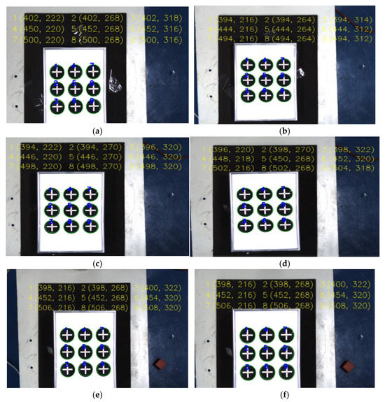 From Figure 9, it is clear that the pixel coordinates of circle centers at 0 mm height differ from those at other heights. In practice, the pixel coordinates of the nine points should not vary significantly with changes in height because the position of the calibration plate does not change significantly. However, as shown in Figure 9, except for the height of 0 mm, the circle center coordinates have changed at the other five heights. The magnitude of this change increases with the height difference. This indicates that height differences do affect the camera’s coordinates. As the height changes, the error gradually increases.