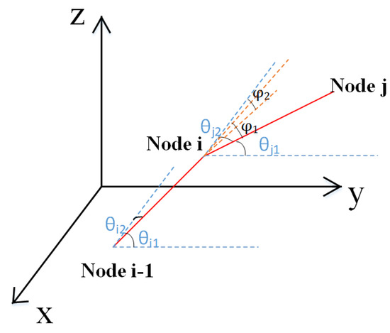 In the formula, θi1 and θi2 are the angles formed by the line connecting node i and the previous node i-1 projected onto the x-axis and y-axis, respectively. Similarly, θj1 and θj2 are the angles formed by the line connecting node j and node i. The differences between θi1 and θj1 and between θi2 and θj2 are denoted as φ1 and φ2, respectively. Ε refers to the constant, ensuring that the expression remains meaningful in practical applications. As illustrated in Figure 12, the sum of these angle differences φi represents the turning angle for the ant’s next move. A smaller value of the turning angle φij indicates a smoother path.