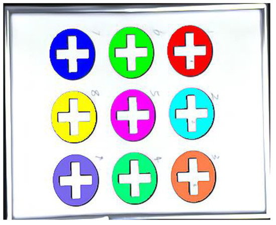 The images of the calibration plate were acquired, and the nine points on the calibration plate were selected using the threshold segmentation method, as shown in Figure 14.