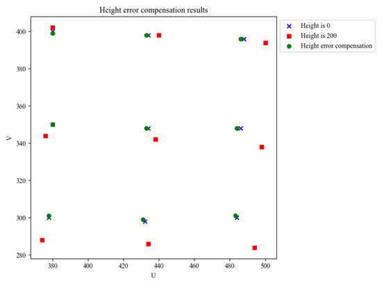 Height error compensation was performed using calibration plates with heights of 0 mm and 200 mm, based on the above image pre-processing results and the height error compensation model we established. The compensation results are shown in Figure 20.