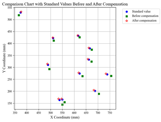 As shown in Figure 22, the coordinates at 60 mm height before and after compensation are compared with the standard coordinates at 0 mm, which do not cause errors due to height changes. It can be seen that the difference between the compensated coordinates and the standard value at 0 mm is small, with a maximum error of five pixels, while the difference between the uncompensated 60 mm coordinates and the standard value at 0 mm is larger, with a maximum error of 12 pixels, and the error is reduced by 58.33%. The compensated coordinates are closer to the true value, which helps to improve the positioning accuracy of the grinding point.