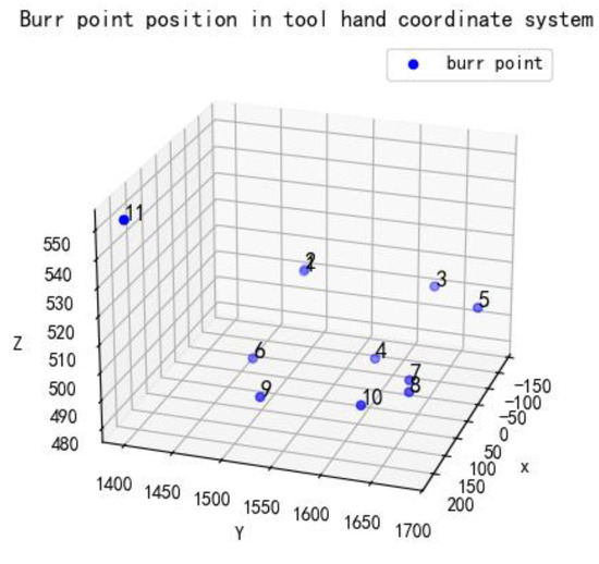 The contour of the burr points in the tool–hand coordinate system is consistent with the actual situation: Burr points 1, 2, 3, 5, and 11 are almost at the same height, while the other burrs are at another height. Burr points 1 and 2 are relatively close together. Burr point 11 is at the bottom left of the image, and the remaining burr points are concentrated in the center of the image, arranged in a circular pattern. The end of the mechanical arm can accurately reach each burr point after the robot coordinates of these burr points have been entered into the robot system.