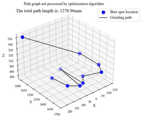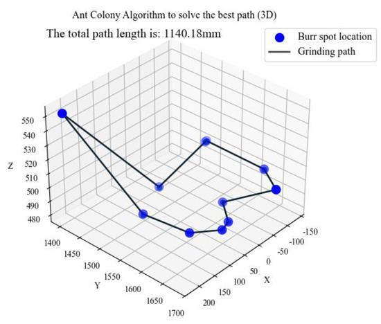 Suppose the mechanical arm first passes through the burr points at the same height, and then, having passed through the burr points at the same height, it passes through the burr points at a different height. The calculated path at this point is 1270.96 mm, as shown in Figure 24. The total length of the grinding path planned by the enhanced ACO algorithm is 1140.18 mm, as shown in Figure 25.